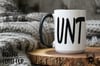 •White mug with black handle, printed on one side